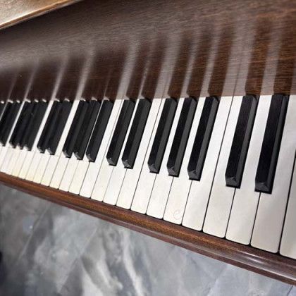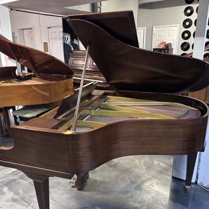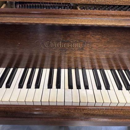 DETAILS: American-made Chickering grand. Refinished with new strings in 2011. Satin natural brown mahogany finish with matching bench. Warm sound and balanced action-Chickering is known for rich tones and classic American craftsmanship.