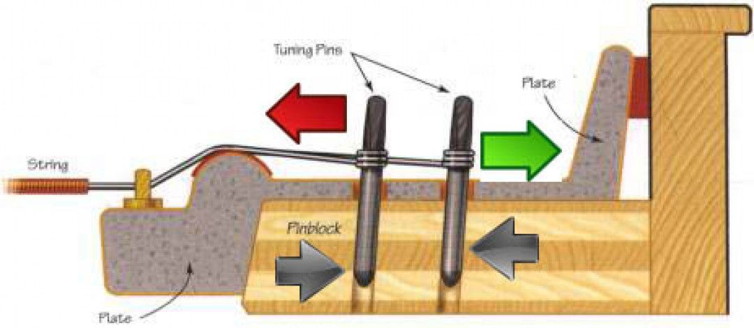 Why does your piano go out of tune. This question has many answers. Let's start with the quality of your piano is it made well, has it spent most of its life indoors and away from windows and open doors. Has the piano ever sustained water damage? Many cases depend on what has happened to your piano over the years and how you have kept up with it. (ABOVE PICTURE) The picture above shows how the tuning pins are sitting inside of your piano. The pinblock is made of wood and wood flexes with temperature or atmosphere change. This causes the pinblock to tighten and relax causing the tension from all the strings to force the pins holding your strings in pitch to shift very little but enough to cause the piano to sound out of tune.